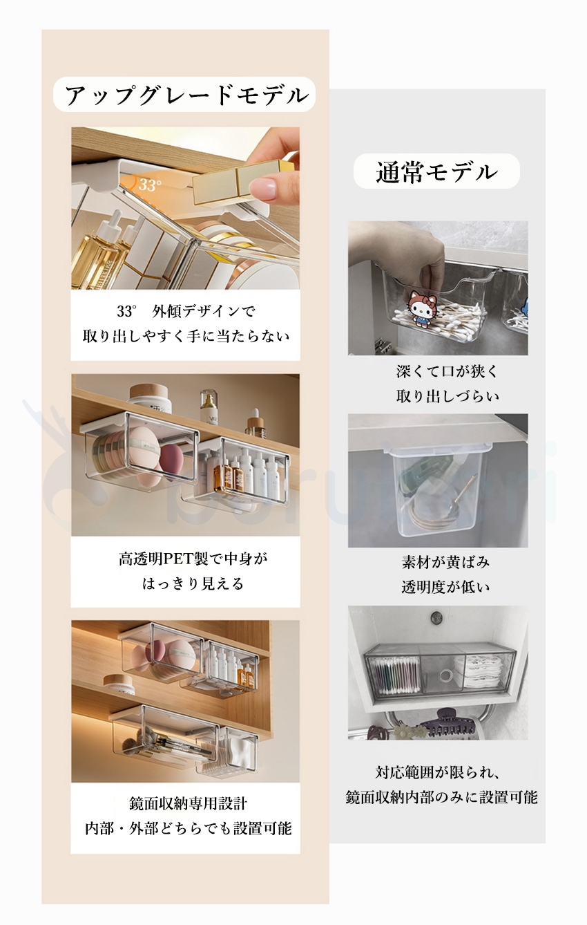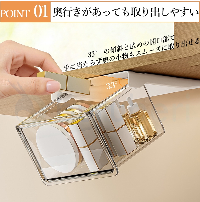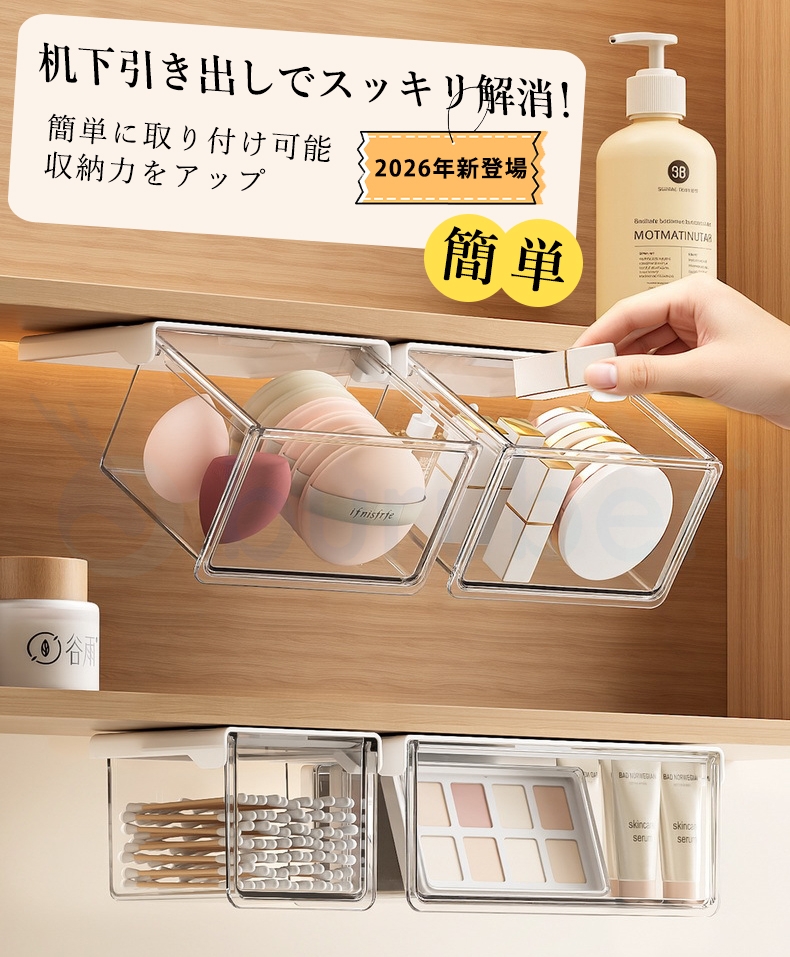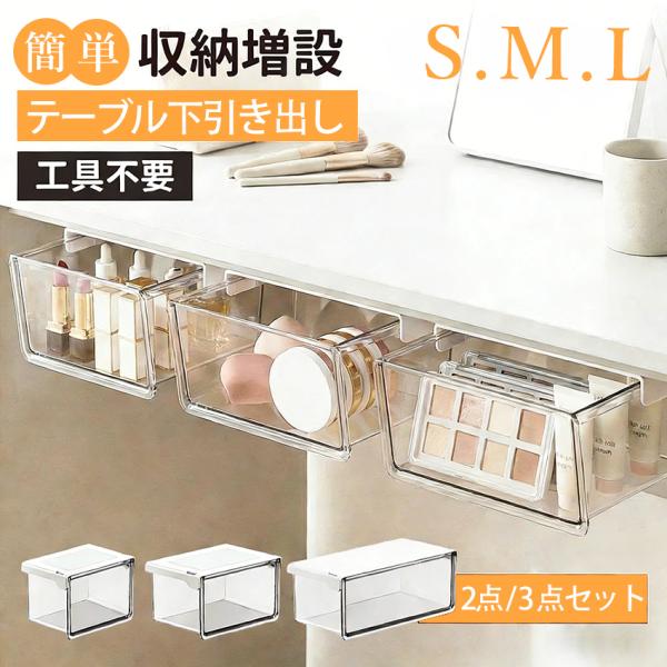 【最安値挑戦!】 収納ボックス 引き出し式 テーブル下 取り付け式 強力両面テープ 透明 PET ワイドオープン 小物整理 コスメ収納 化粧品収納 セット S M L