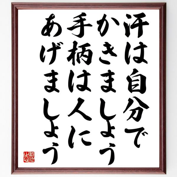 名言「汗は自分でかきましょう、手柄は人にあげましょう」手書き書道色紙額/受注後の毛筆直筆