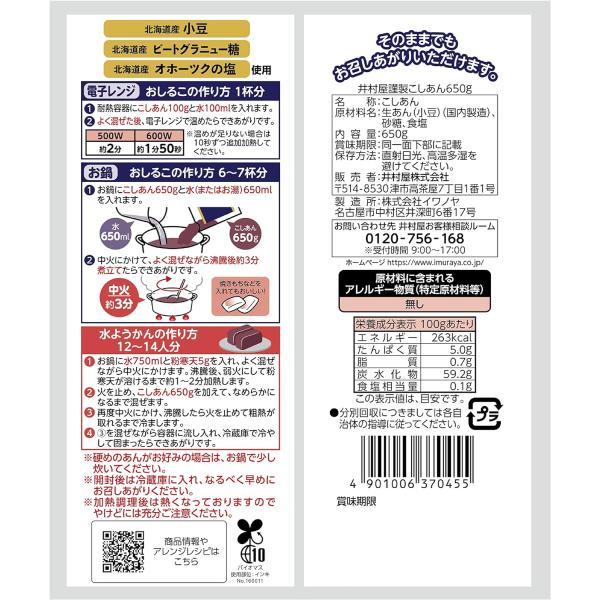 井村屋 謹製 こしあん 650g あんこ 餡子 漉し 餡 徳用 手で切れる ハサミ不要 簡単 保存 便利 袋 パウチ 北海道 無添加