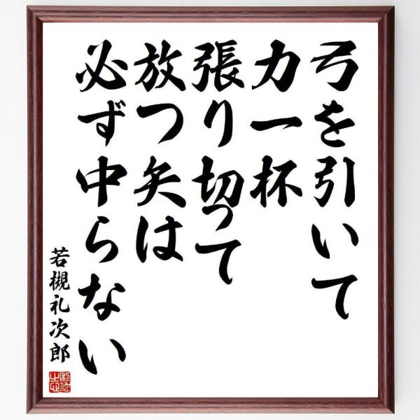 若槻礼次郎の名言「弓を引いて力一杯張り切って放つ矢は必ず中らない」手書き書道色紙額/受注後の毛筆直筆
