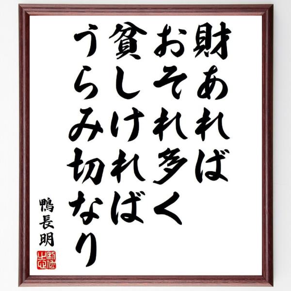 鴨長明の名言「財あればおそれ多く、貧しければうらみ切なり」手書き書道色紙額/受注後の毛筆直筆
