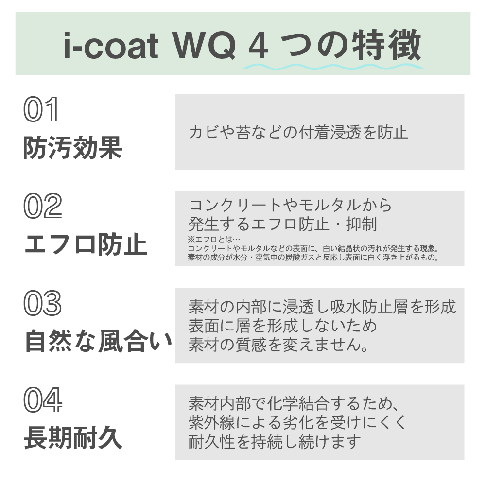 石材・コンクリート用吸水防止剤 i-coat WQ 1L 防汚効果 カビ 藻 付着防止 エフロ防止 白化防止 長期耐久 石材 コンクリート レンガ コーティング剤