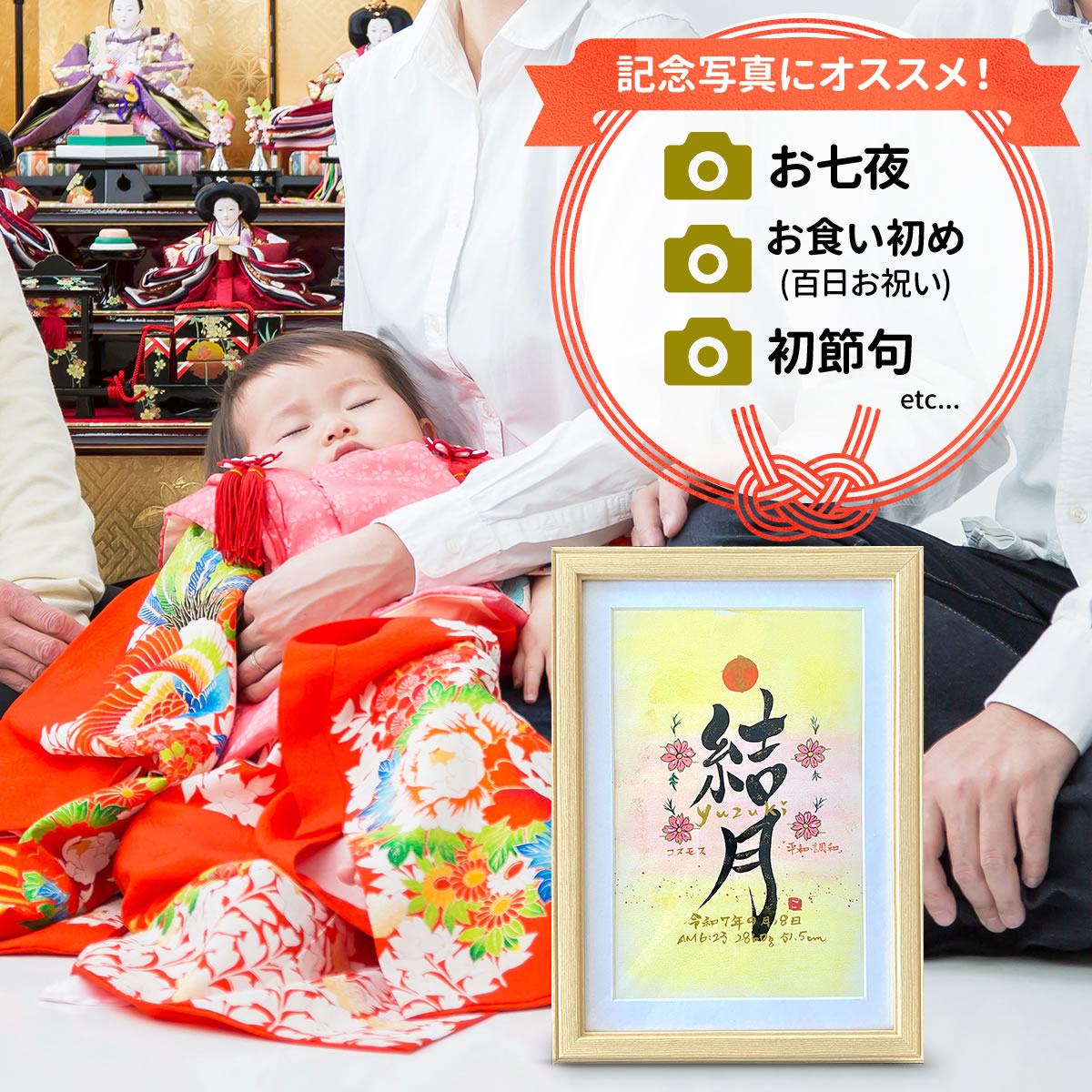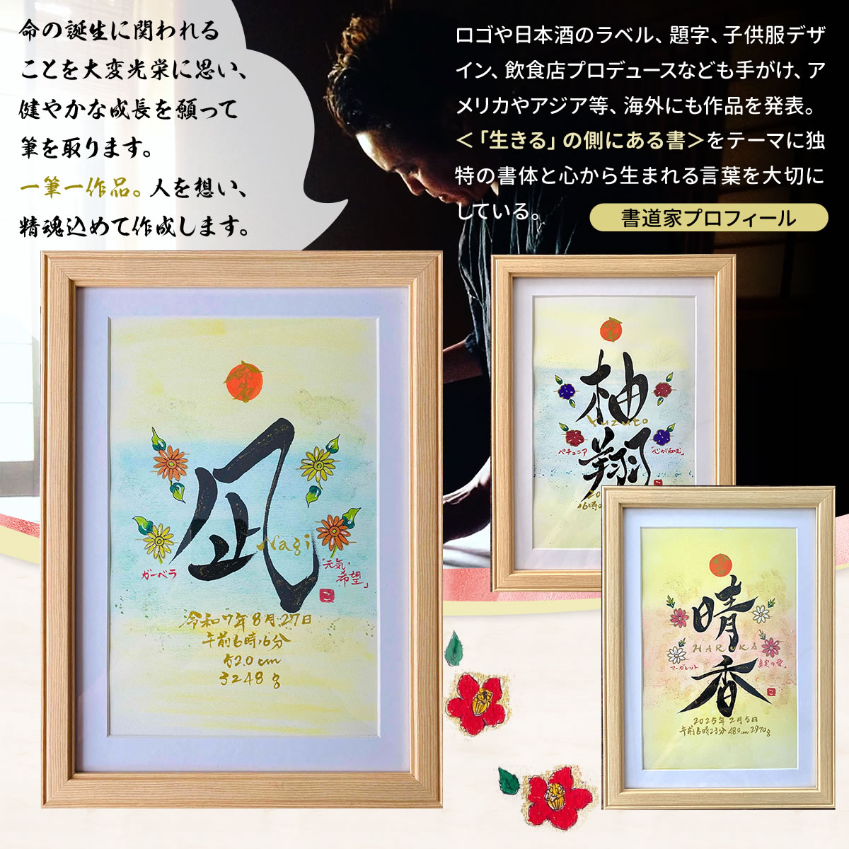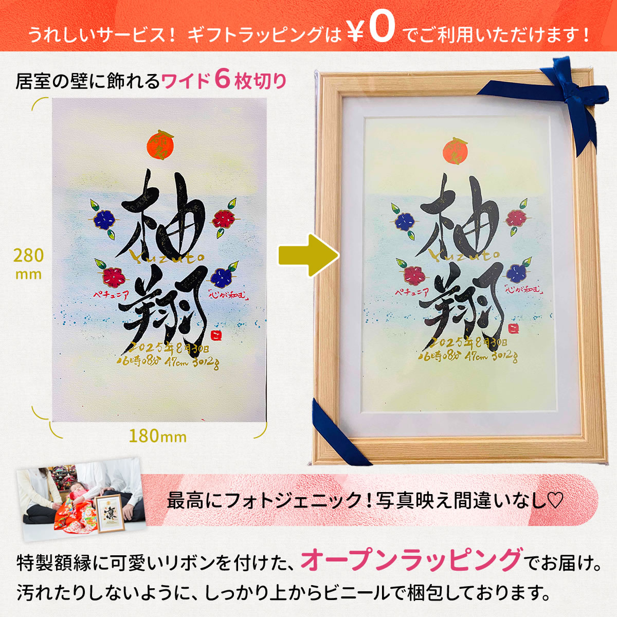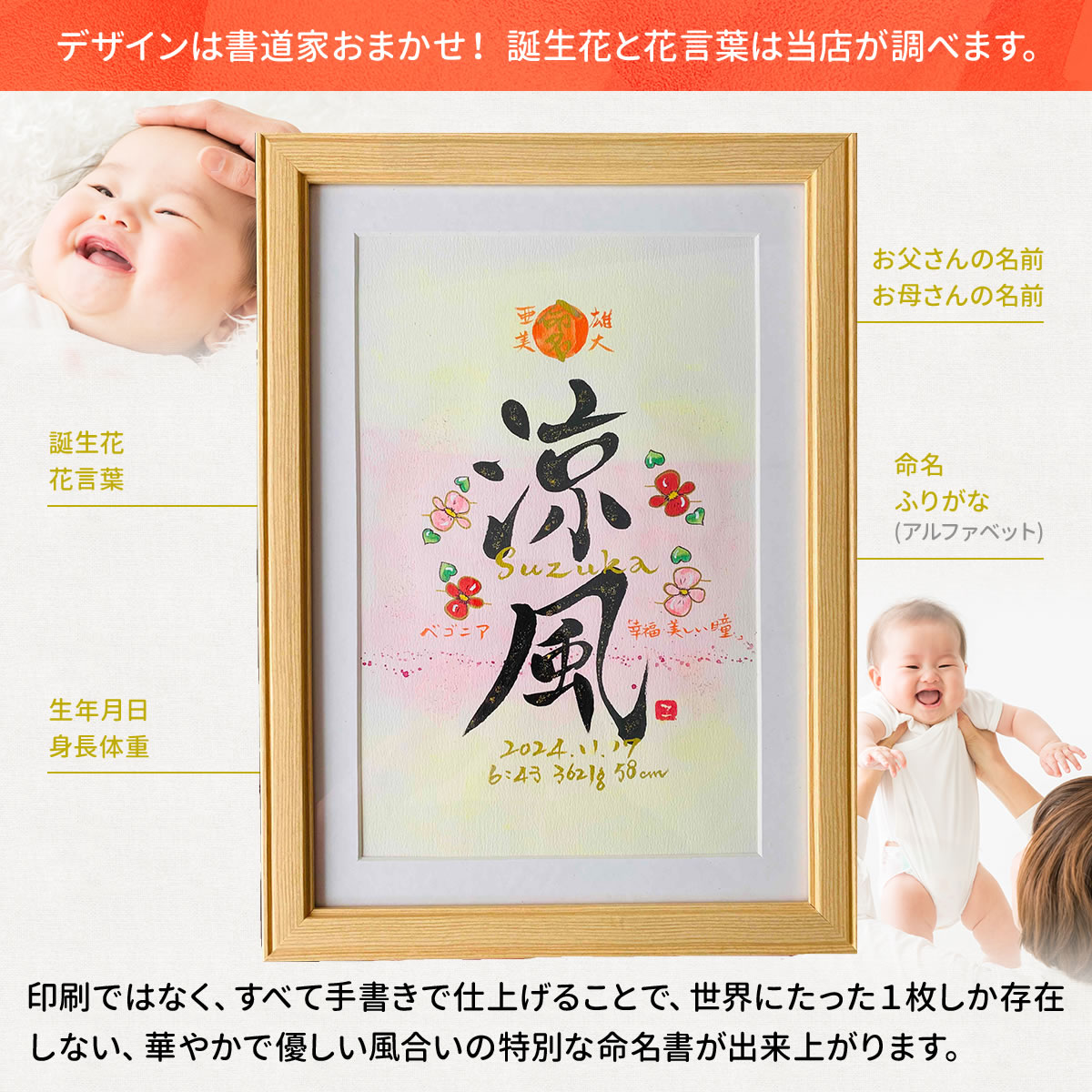 命名書 出産祝い おしゃれ 手書き オーダー 赤ちゃん 代筆 命名紙 命名用紙 書道家 プレゼント 世界でひとつ!誕生花のイラスト入り 命名書(ワイド6切りサイズ)