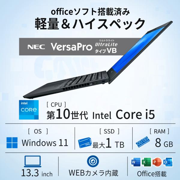 【WEBカメラ+無線LAN内蔵】ノートパソコン Windows11 Core i5 第10世代 13.3インチ Office搭載 NEC Versapro VB-9 SSD1TB メモリ8GB パソコン PC 中古 フルHD