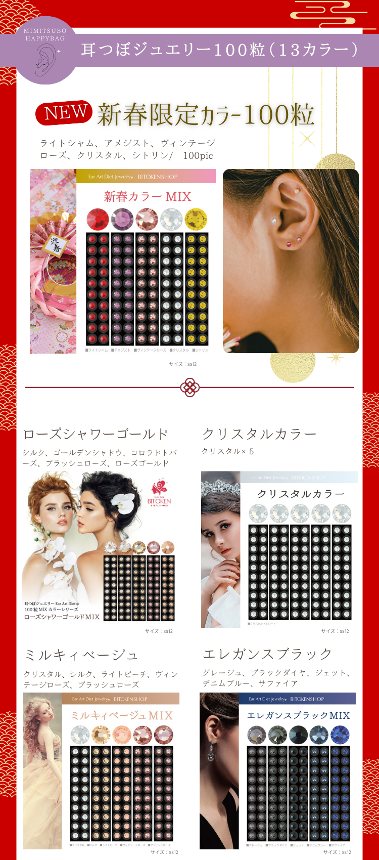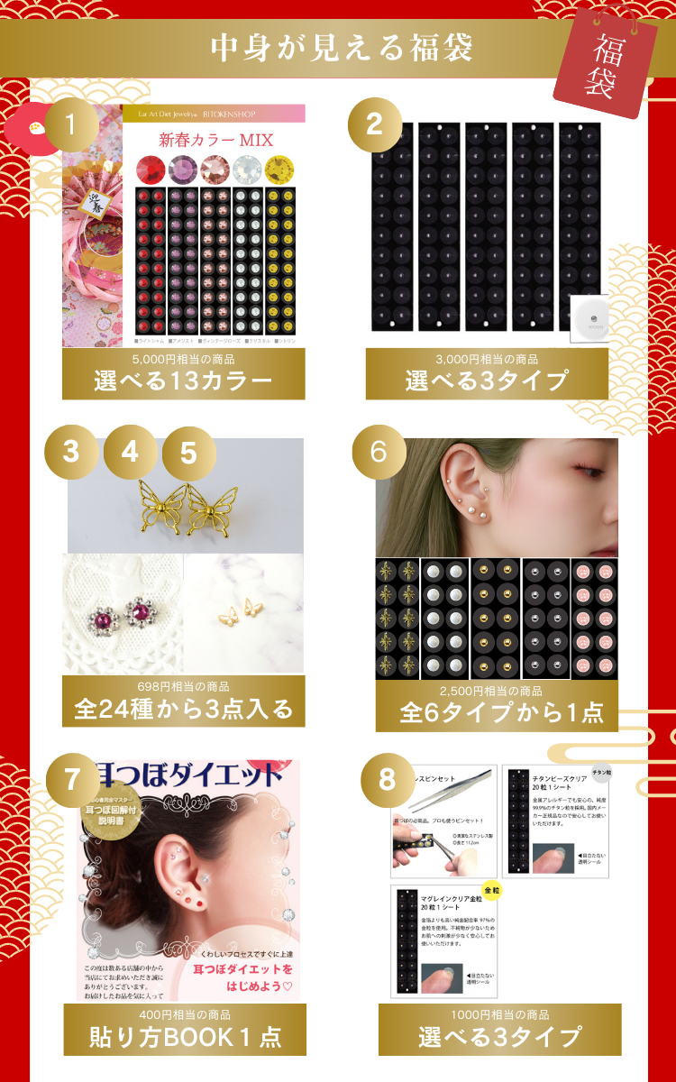 <新春福袋>耳つぼジュエリー【200粒の大福袋10点セット】<選べる耳つぼジュエリー100粒>耳つぼシール選べる100粒耳つぼダイエット<送料無料>耳ツボシール