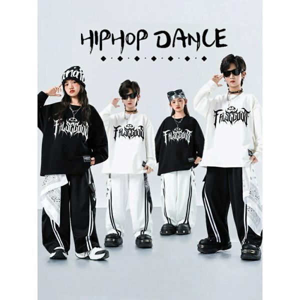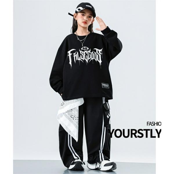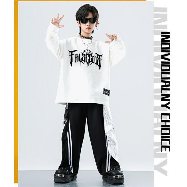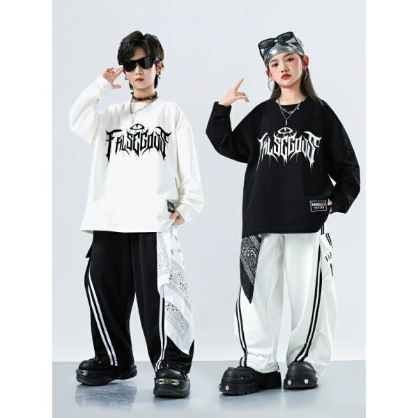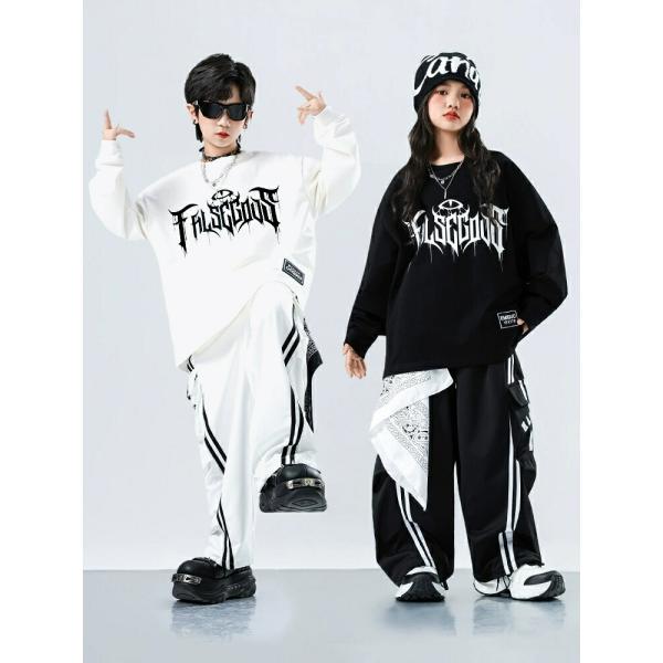 キッズ ダンス 衣装 黒 白 セットアップ ヒップホップ スウェット パンツ 男の子 女の子 KPOP 韓国 ダンス衣装 キッズ ストリート系 長袖 練習着 発表会 団体服