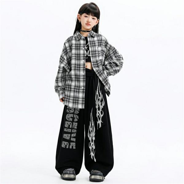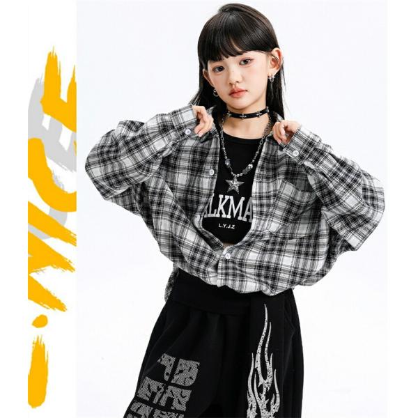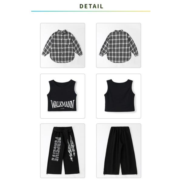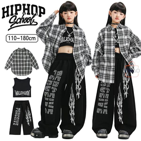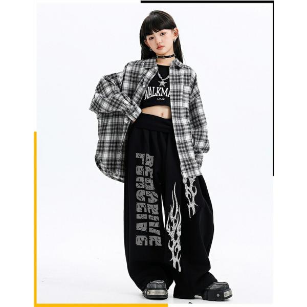 ダンス 衣装 チェック キッズ セットアップ 男女 ヒップホップ チェック柄 3点セット 黒 炎 パンツ キッズ タンクトップ へそ出し ストリート系 発表会 練習着