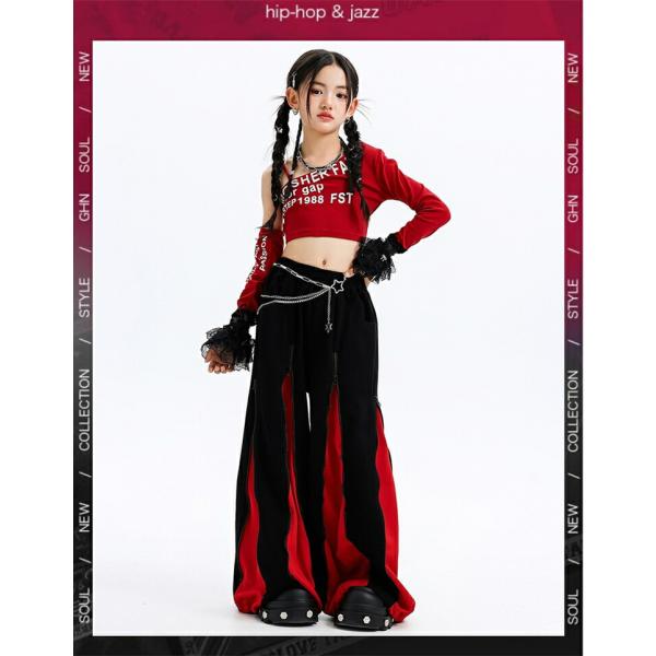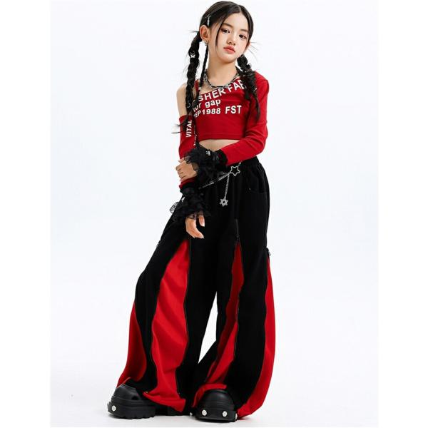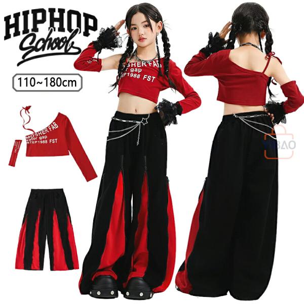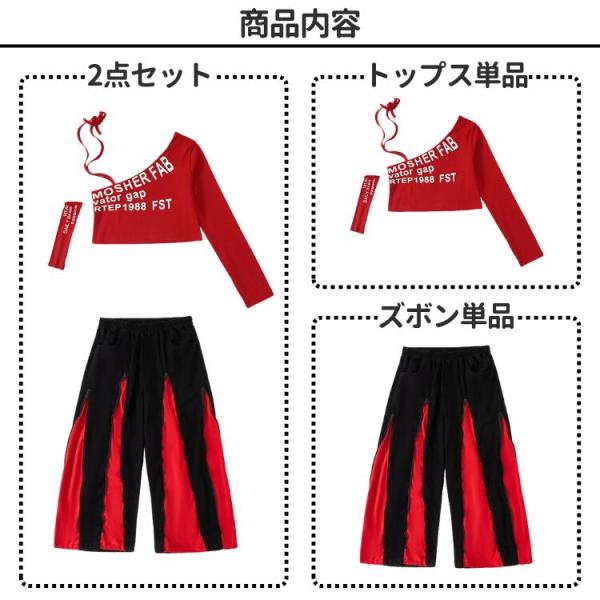 キッズ ダンス 衣装 ヒップホップ ガールズ セットアップ へそ出し ワンショルダー 赤 黒 ダンス衣装 かっこいい 発表会 練習着 ステージ衣装 アイドル 団体服