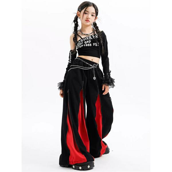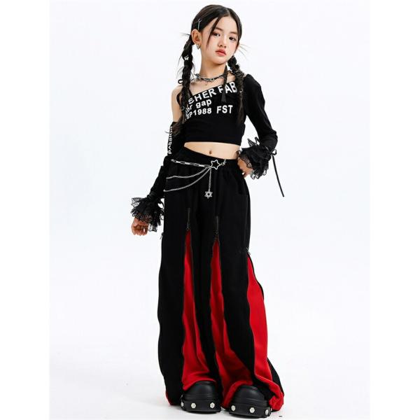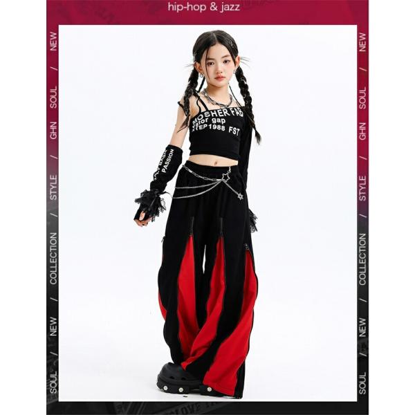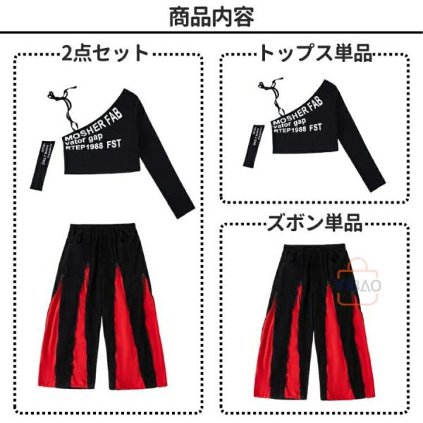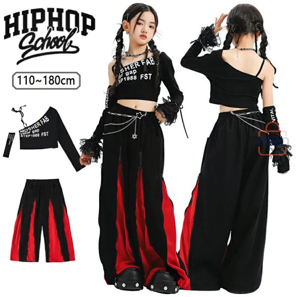 キッズ ダンス 衣装 ヒップホップ ガールズ セットアップ へそ出し ワンショルダー 赤 黒 ダンス衣装 かっこいい 発表会 練習着 ステージ衣装 アイドル 団体服