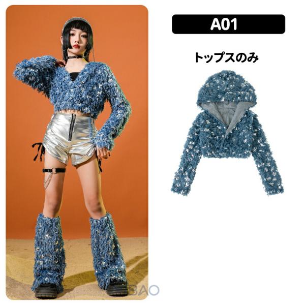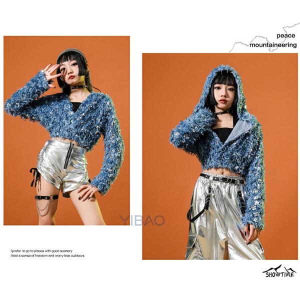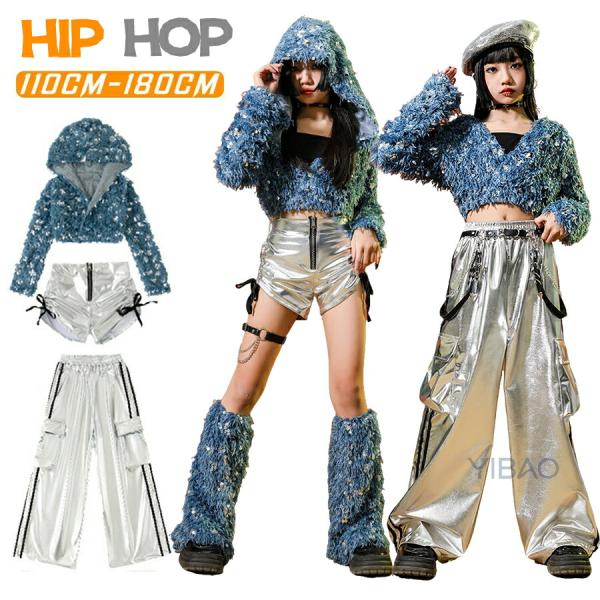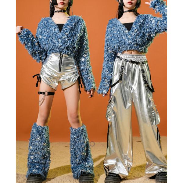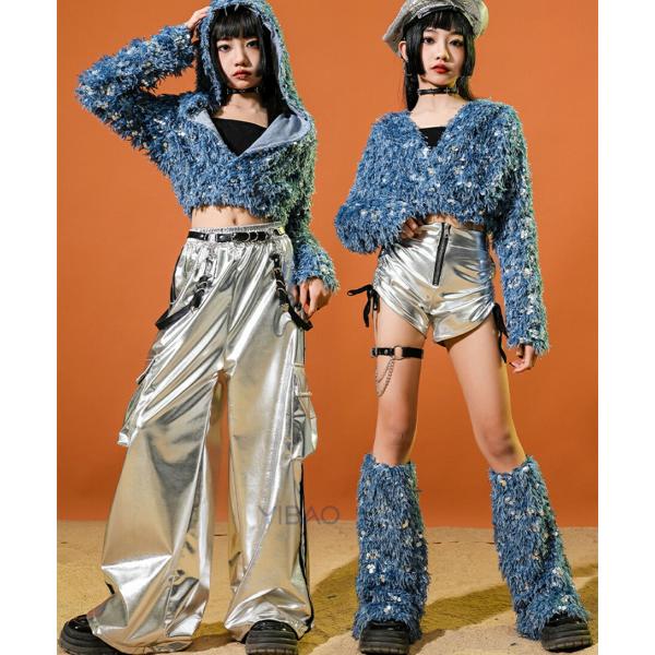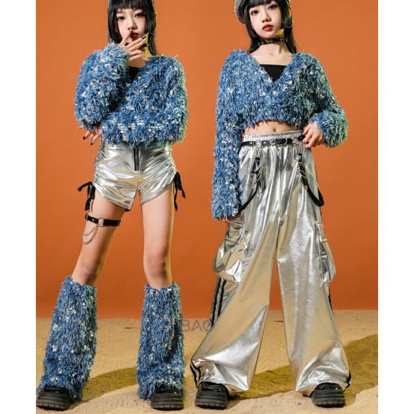 韓国 k-pop HIPHOP キッズ ダンス衣装 キラキラ スパンコール ブルー シルバー セットアップ 女の子 上下セット 長袖トップス カーゴパンツ 短パン ジャズダンス