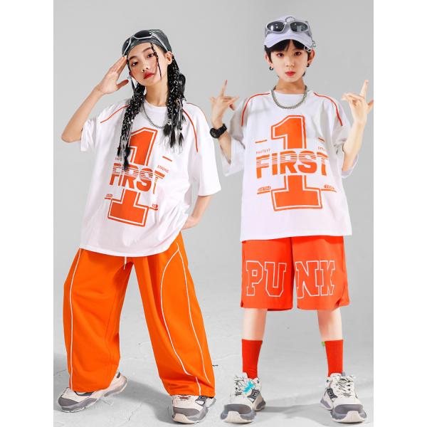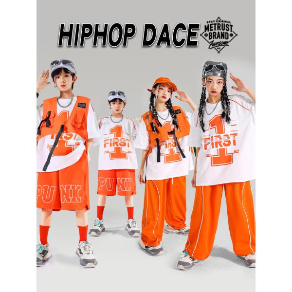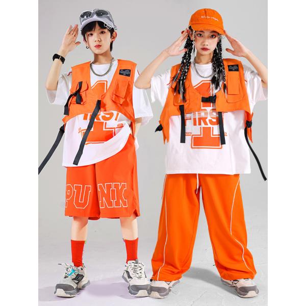 ヒップホップ ダンス衣装 セットアップ 白 オレンジ 派手 Tシャツ フィッシングベスト パンツ キッズダンス衣装 子供ダンス服 ダンスウェア 韓国 K-POP