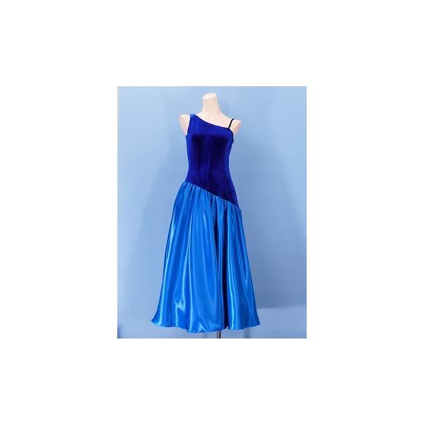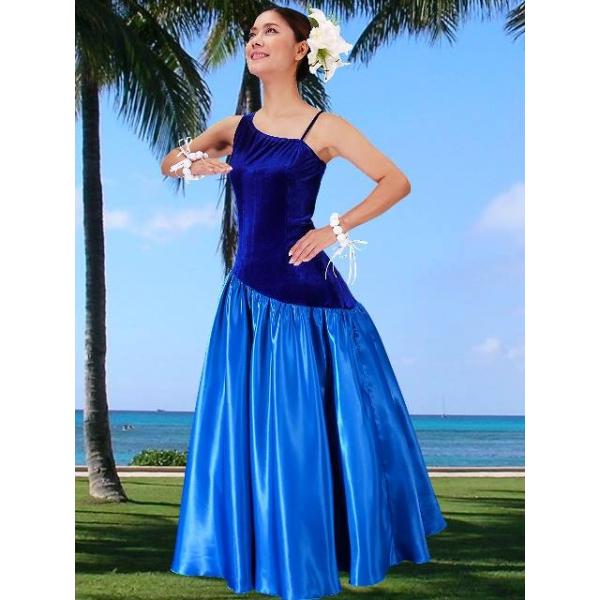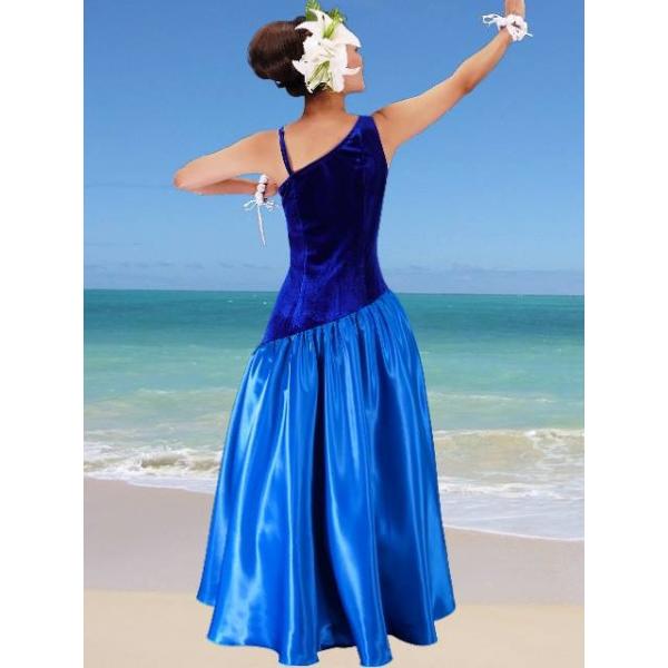 フラダンス ワンショルダー ベルベット・シャンタン斜め切り替え ドレス ブルー LLサイズ 2289blLL