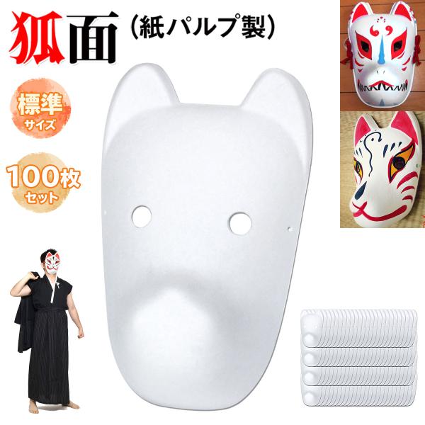狐面 お面 狐 仮面 マスク コスプレ 無地 白 おめん ペイント 飾り お祭り 紙パルプ製 標準サイズ 100枚セット