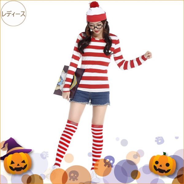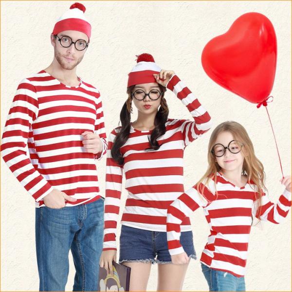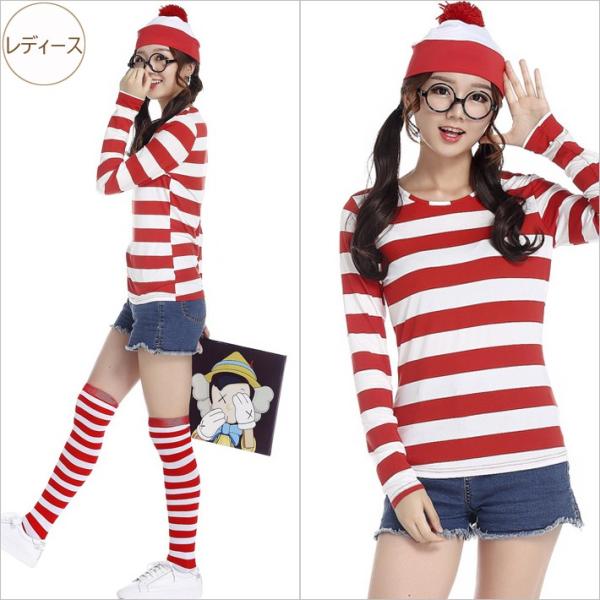 ウォーリー ハロウィン コスプレ ボーダーロンT メガネ 帽子 ハイソックス 3点 4点 セット Where's Wally コスチューム 眼鏡 仮装