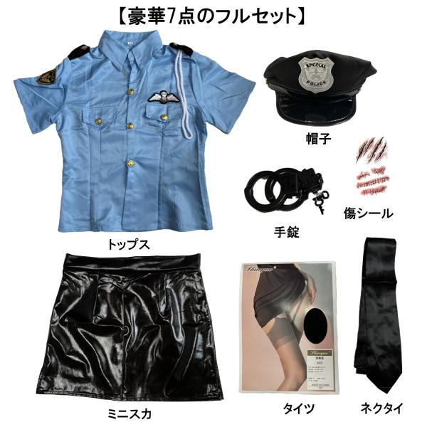 コスプレ ミニスカポリス セクシー 可愛い 婦人警官 警察 ポリス レディース ハロウィン 傷シール付 仮装 7点セット ブルー