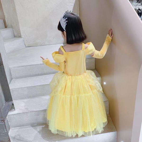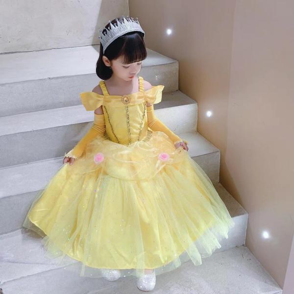 4点 ベル ドレス 美女と野獣 コスプレ ティアラ ステッキ ヘア飾り 子供服 ワンピース 衣装 コスチューム ディズニーランド パーティー プリンセス お姫様