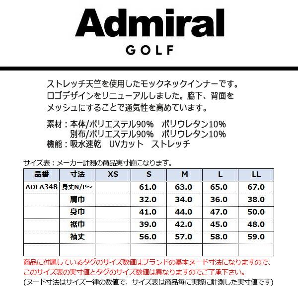 アドミラルゴルフ インナーシャツ レディース 長袖 ハイネック 吸水速乾 UVカット ストレッチ ゴルフウェア ブランド 春 夏 秋 ADLA348 Admiral