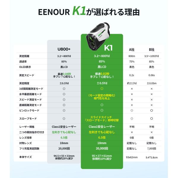 26年新発売 EENOUR K1 ゴルフ距離計 黒LCD レーザー距離計 ミニ 最速0.02秒台 6.5倍望遠 競技モード 設定の簡略化