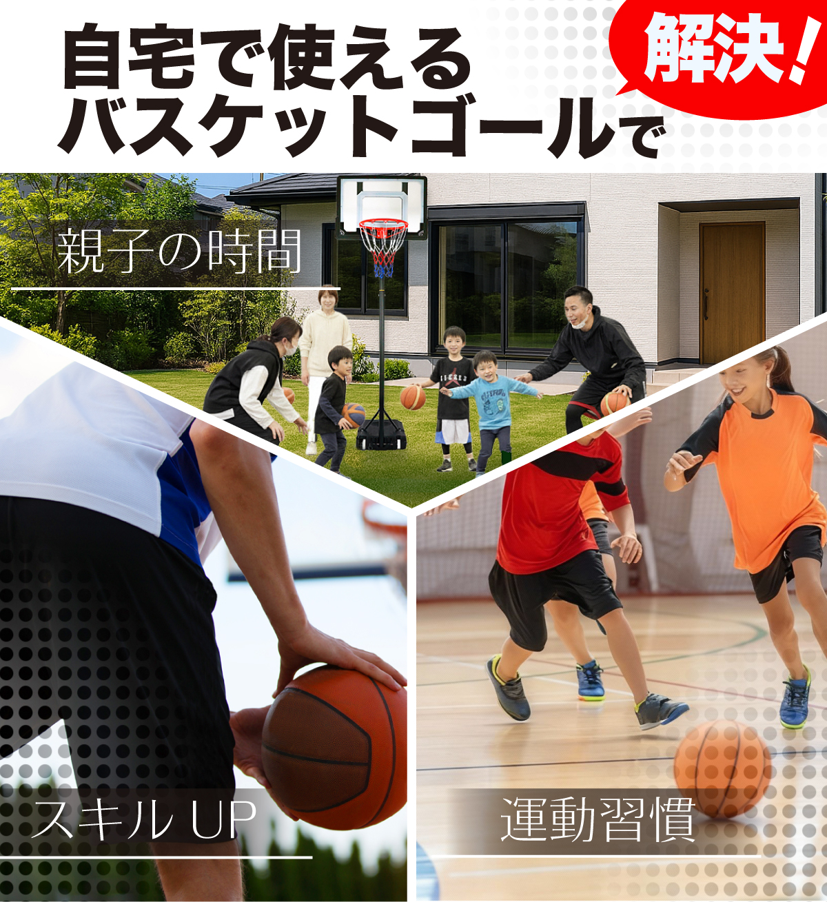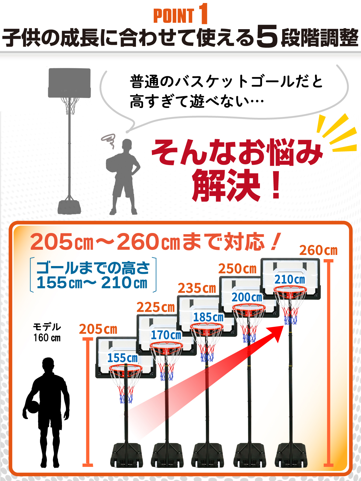 バスケットゴール 子供用 屋外 高さ5段階調節 155〜210cm バスケ リング 庭 自宅 シュート練習 トレーニング 日本語説明書 キャスター付き