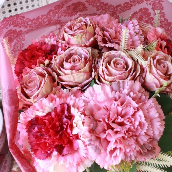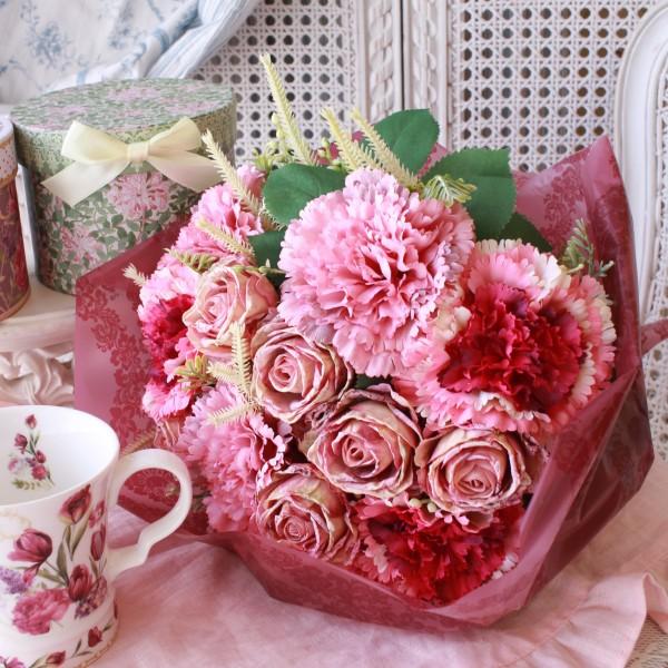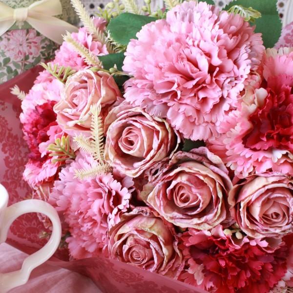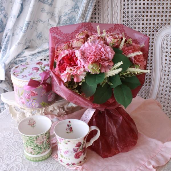 (母の日数量限定) 造花 ブーケ&マグ1個セットB 花束 マグカップ カーネーション ギフト アーティフィシャルフラワー シルクフラワー バラ 薔薇 かわいい 高級