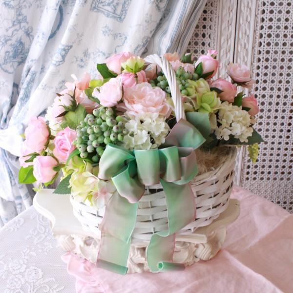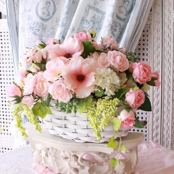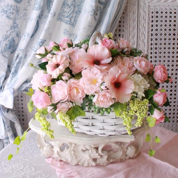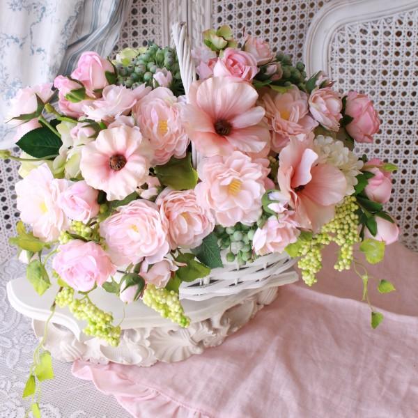 造花 フラワーアレンジメント ラナンキュラスのカゴアレンジ 洋風 ギフト アーティフィシャルフラワー シルクフラワー アートフラワー バラ 薔薇 かわいい 贈り
