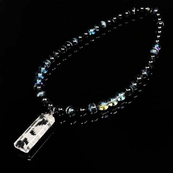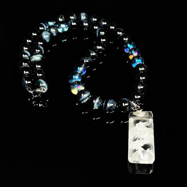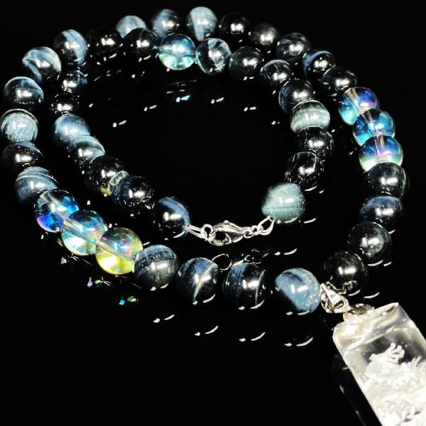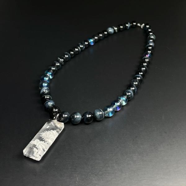 天然石 ネックレス 決断・前進を促す浮彫皇帝龍本水晶プレート ブルータイガーアイ ブルーオーラ 芸能人 御用達 URN9