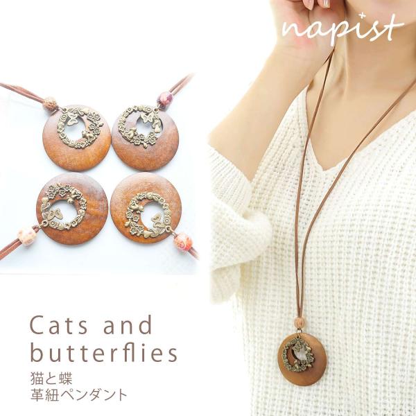 ロングネックレス レディース 革紐 ネックレス チェーン レザー 革 革ひも ロング ゴールド フラワー ビーズ アクセサリー 北欧 猫 蝶 NPNS047 女性 ペンダント