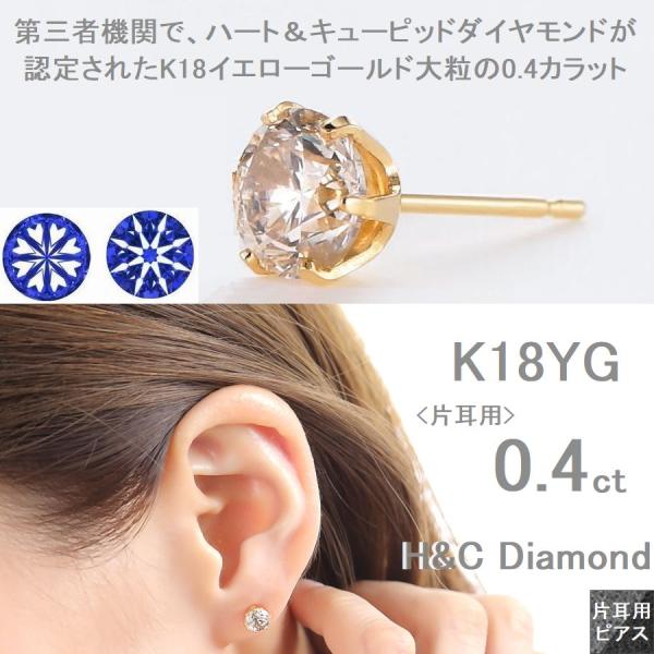 ダイヤモンド ピアス 片耳 一粒 ダイヤピアス K18 0.4カラット ハート&キューピッドダイヤモンド鑑別カード付き 50代 40代 イエロー 記念日 誕生日 プレゼント