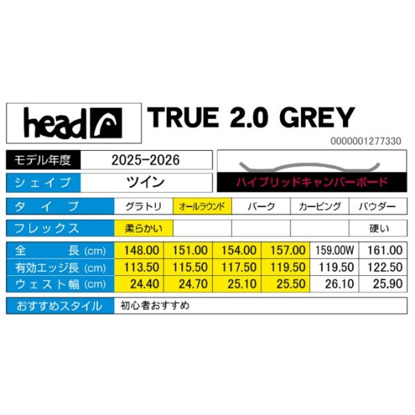 ヘッド(HEAD) スノーボード 板 メンズ トゥルー 2.0 グレー TRUE 2.0 GREY オールラウンド【国内正規品】【25-26 2025-2026】