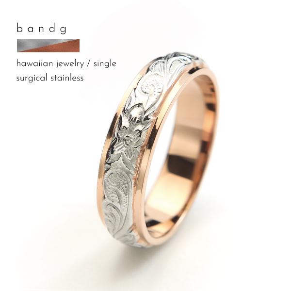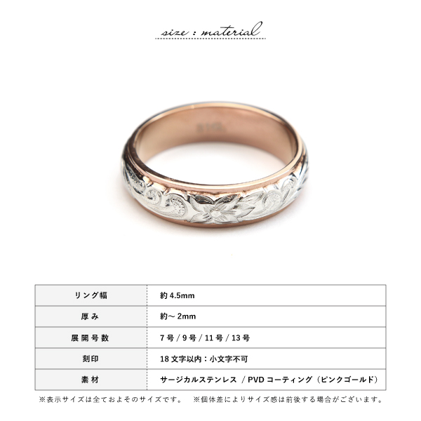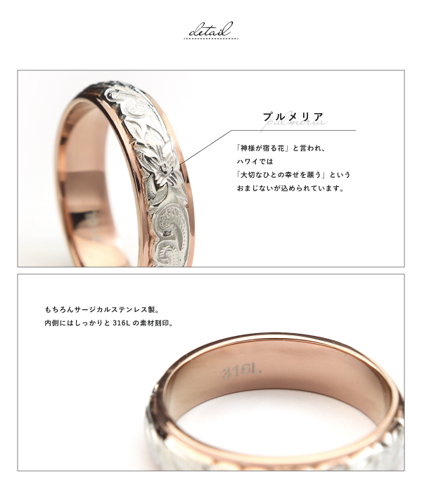 リング ステンレス サージカルステンレス 金属アレルギー ハワイアンジュエリー 細身 甲丸 プルメリア スクロール 刻印 名入れ