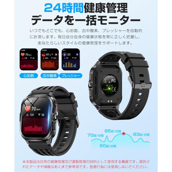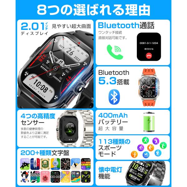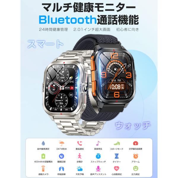 スマートウォッチ メンズ Bluetooth通話 2.01インチ曲面 血中酸素 心拍 歩数 カロリー 健康管理 着信通知 3ATM防水 リストバンド 腕時計 睡眠 400mAh大容量