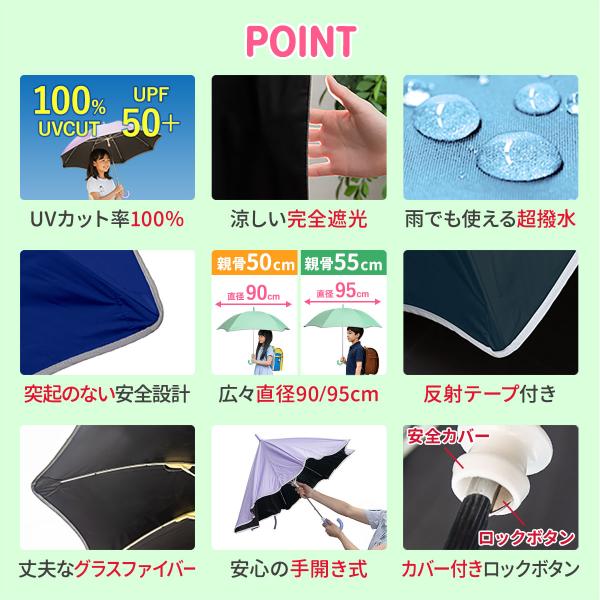 傘 子供 キッズ傘 晴雨兼用傘 50cm 55cm 完全遮光 遮熱 UVカット 日傘 雨傘 男の子 女の子 軽量 安全設計 露先が飛び出ない 反射テープ付き 1年保証 送料無料
