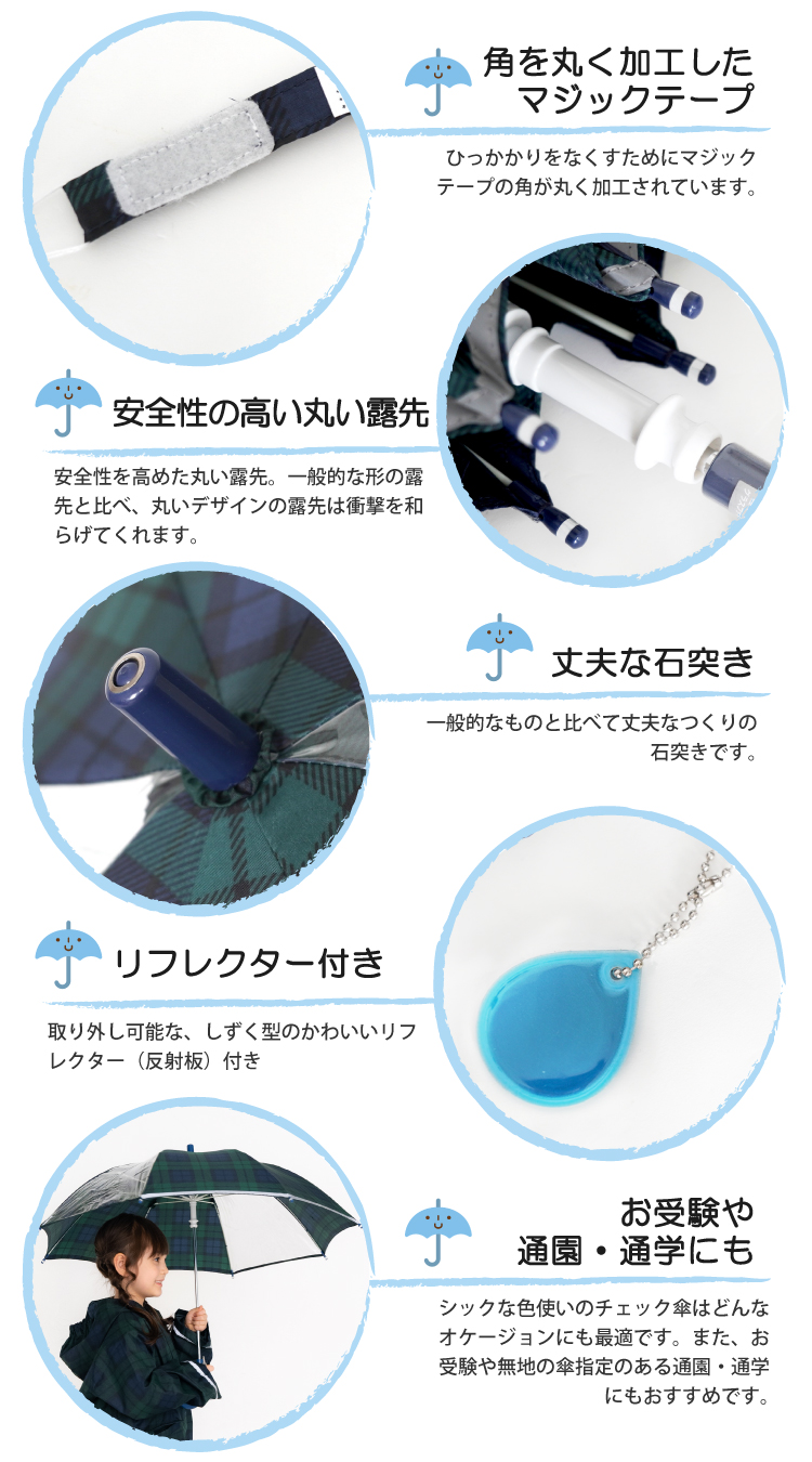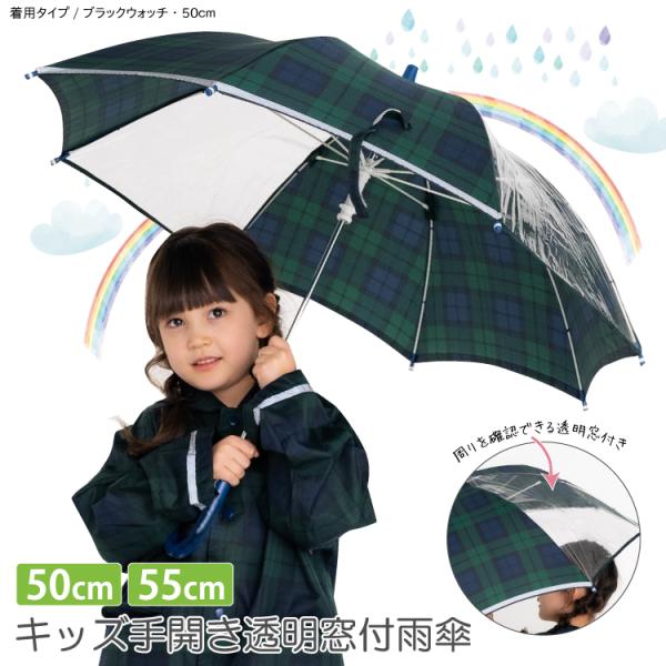 子供 傘 55cm 50cm 手開き 雨傘 ブラックウォッチ柄 人気 安全 反射 男児 女児 キッズ 透明窓 軽量 安全 耐風 反射 かさ