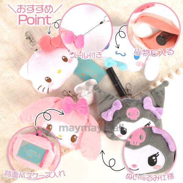 サンリオ ぬいぐるみパスケース リール付き 定期入れ キティ マイメロ クロミ シナモロール ギャルキティ 通学 女の子