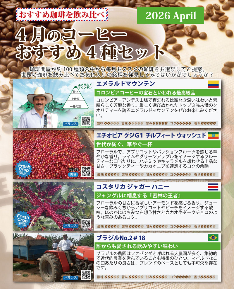 【メール便・配達日時指定不可】 4月のおすすめ豆4種類お試しコーヒーメール便 (4袋セット/珈琲解説付き)2026年