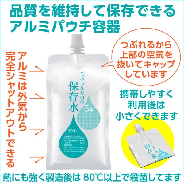 車で保管 保存水 5年 アルミパウチ容器 550ml 30本 ミネラルゼロ 車内で保管 耐熱 高温 500mlから増量【hzn】