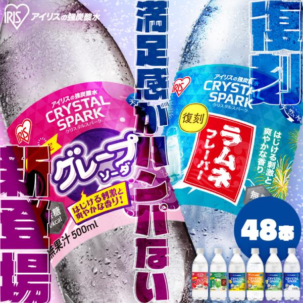 [復刻ラムネ・グレープソーダ登場!]炭酸水 500ml 48本 (24本入×2箱) アイリスオーヤマ クリスタルスパーク 強炭酸水 無糖 ペットボトル アイリスフーズ 炭酸 *