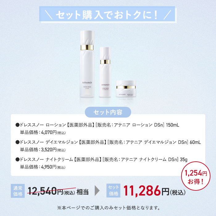 アテニア 公式 ドレススノー 化粧水・日中用乳液・夜用クリーム セット 医薬部外品 美白化粧水 シワ改善 美白クリーム 美白乳液 美白 エイジングケア