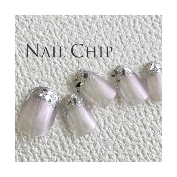 ネイルチップ ショート ジェル パール シア― パープル フレンチガラス デザイン 12枚入り