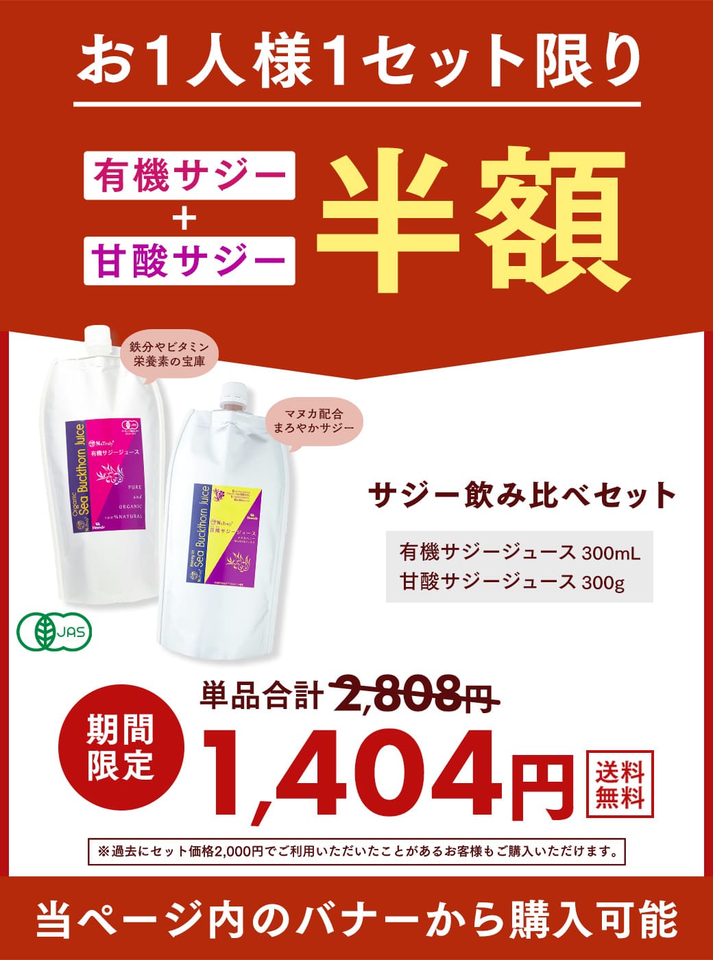 サジージュース 900ml 2本セット オーガニック 100% 有機JAS認証 有機 栄養機能食品(ビタミンC) シーバックソーン サジードリンク 沙棘 鉄分補給