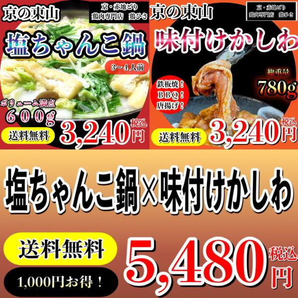 お取り寄せ ボリューム満点 送料無料 1000円OFF 鶏肉専門店の特製塩ちゃんこ鍋セット(3〜4人前)×味付けかしわセット(3〜4人前) まとめ買いセット