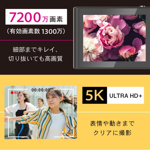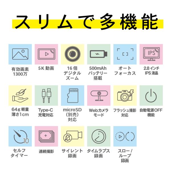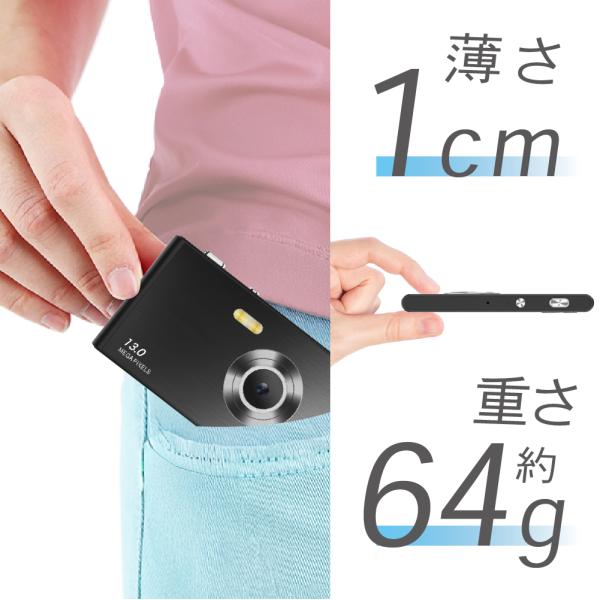 スリムデジタルカメラ 1300万画素 5K動画対応 16倍ズーム 2.8インチIPS 薄型約1cm 軽量64g Type-C充電 バッテリー内蔵 microSD256GB対応 FaCLOSS ブラック