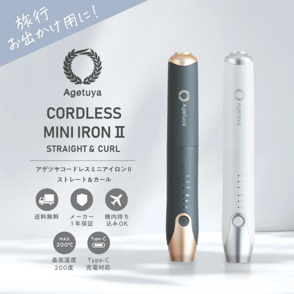 アゲツヤ コードレスミニアイロン2 ミニヘアアイロン ホワイト・グレー 2way Type-C充電 充電式 持ち運び 旅行 機内持ち込み可 携帯耐熱ポーチ 海外対応 爆買