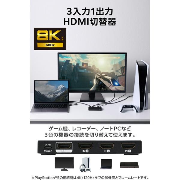 エレコム HDMI切替器 8K対応 3in1 専用リモコン付 8K60Hz対応 3入力 HDMI)+1出力 HDMI) メタル筐体 ブラック DH-SW8KB31BK/E