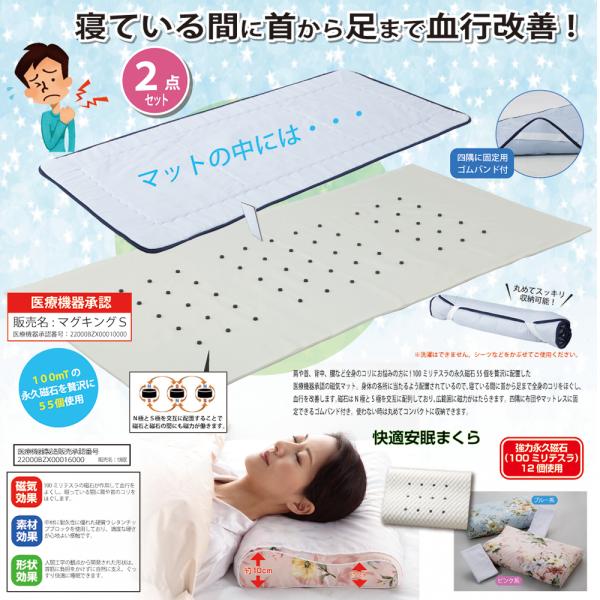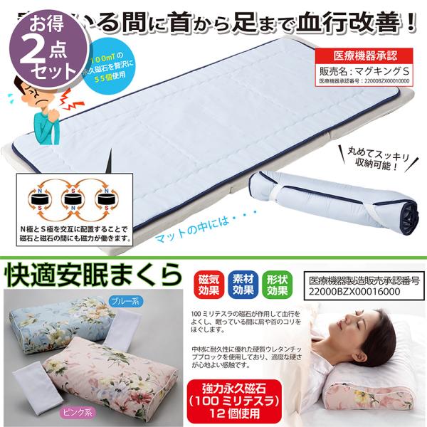 お得な 2点セット 医療機器承認の磁気マット & ニュー磁気枕 ブルー 肩 首 背中 腰 全身のコリにお悩みの 方に 永久磁石 快眠まくら Eclea 爆売 爆買