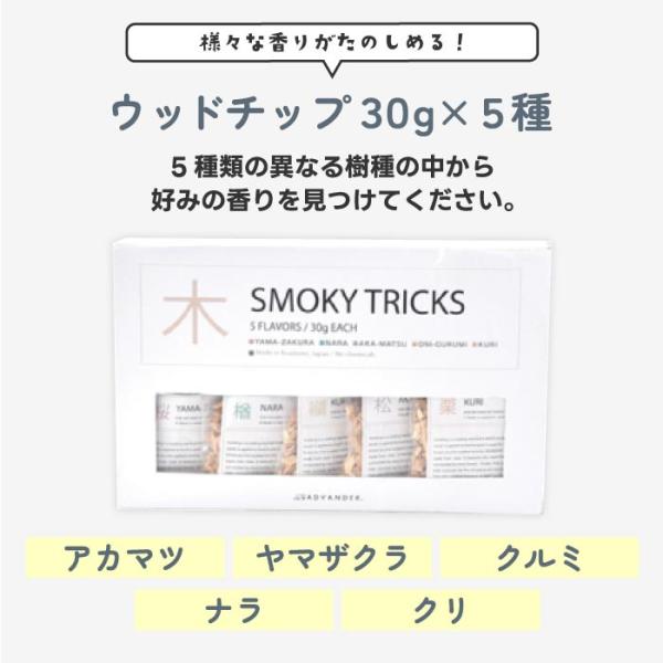 スモークチップ ウッドチップ 燻し用 ADVENDER SMOKY TRICKS 燻製用 香り付け 木片 アウトドア 簡単 燻製 スモーク アウトドア キャンプ 日本製 直火 5種 家庭