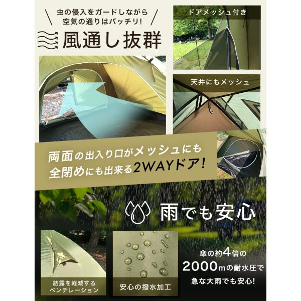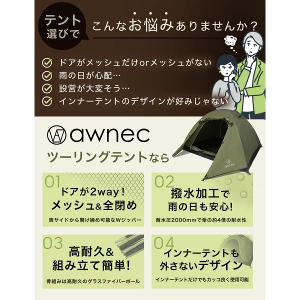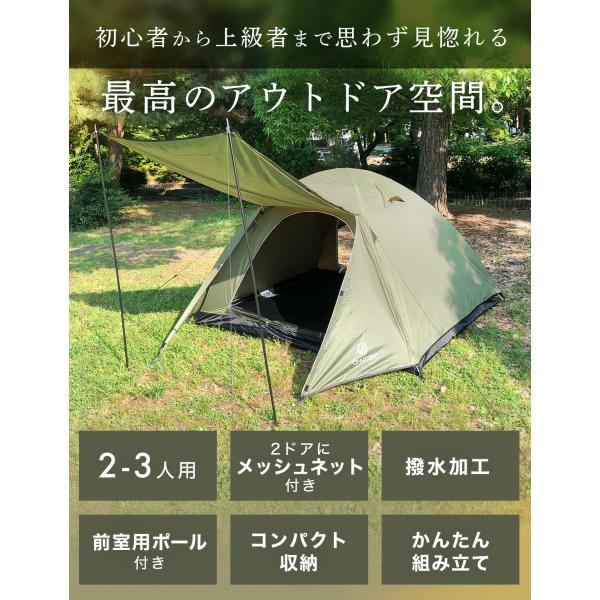 テント 2-3人用 前室ポール付き ドームテント 日本ブランド ソロテント キャンプ ツーリングテント カーキ 撥水加工 2人用 3人用 メッシュドア付き awnec