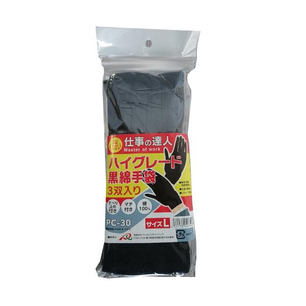 日本製品質 PC-30 黒綿手袋 3双組|綿100% コーマ糸 滑り止めPVCドット付き マチ付き 作業用 DIY 接客用 ドライブ用 手袋