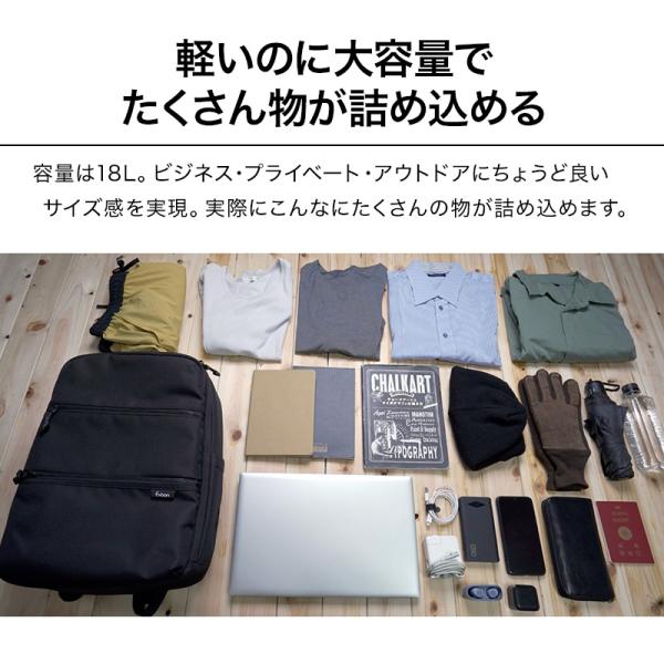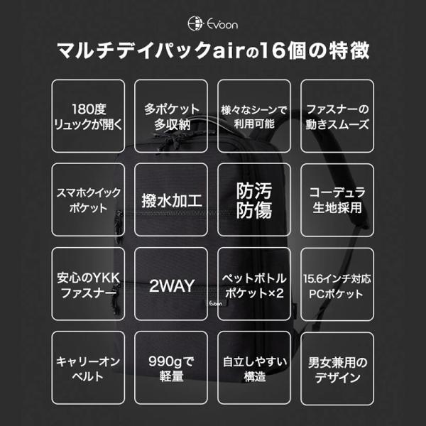 公式 Evoon マルチデイパックair 男女兼用 メンズ レディース 990g 軽量 18L 多機能 多収納 多ポケット 撥水 防汚 防傷 YKK PC パソコン 15.6インチ リュック