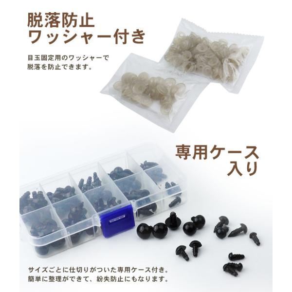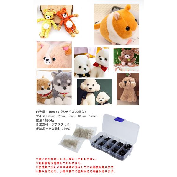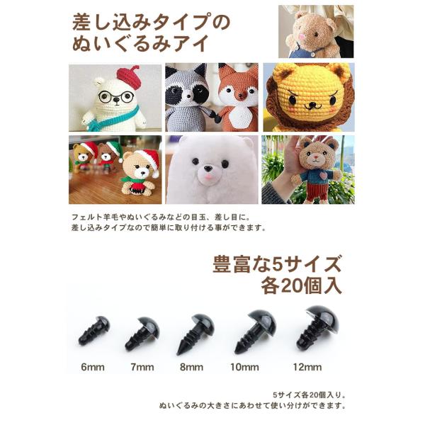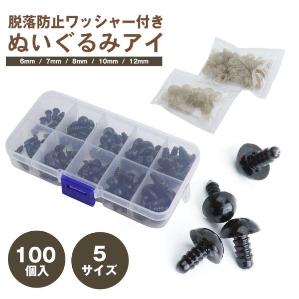 ぬいぐるみ アイ 黒目 さし目 ワッシャー 100個 5サイズ 手芸 パーツ 目玉ボタン 人形 フェルト ホビー ソリッドアイ プラスチック 6mm 7mm 8mm 10mm 12mm